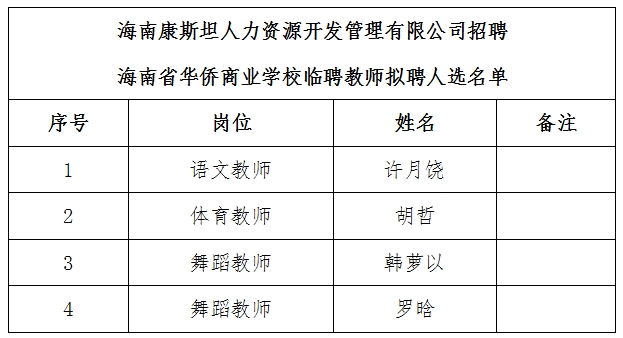 根据《 海南康斯坦人力资源开发管理有限公司招聘海南省华侨商业学校临聘教师公告》要求,先后组织实施了资格审核、笔试、面试、体检等工作,经招聘工作领导小组研究确定拟聘人选,现将拟聘人选名单予以公示,公示期限:2025年6月13日起至2025年6月19日17:30止。如对公示结果有异议,请于2025年6月19日17:30前以书面形式反映至招聘工作办公室(联系电话:0898-65858003),逾期将不予受理。