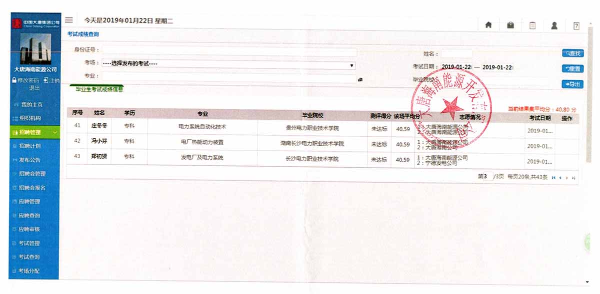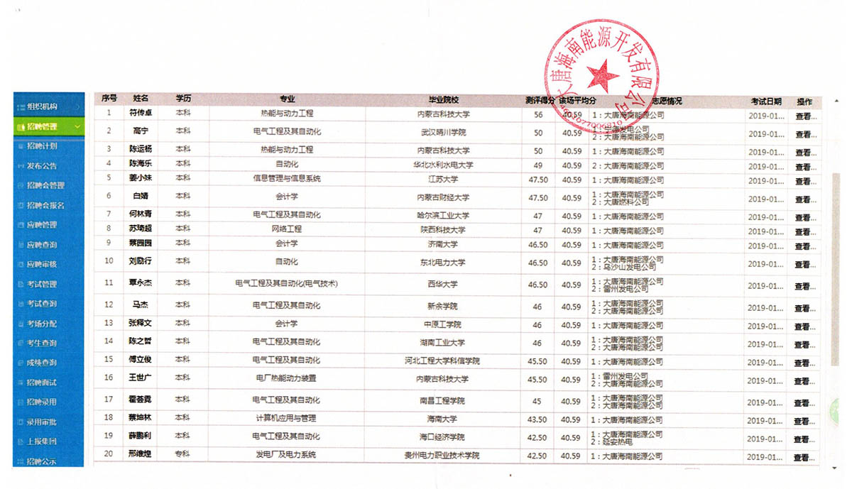 根据《大唐海南能源开发有限公司本部2019届应届毕业生招聘上机考试方案》,现将大唐海南能源开发有限公司本部2019年应届毕业生招聘上机考试成绩进行公示,公示期为2019年1月23日至2018年1月29日。